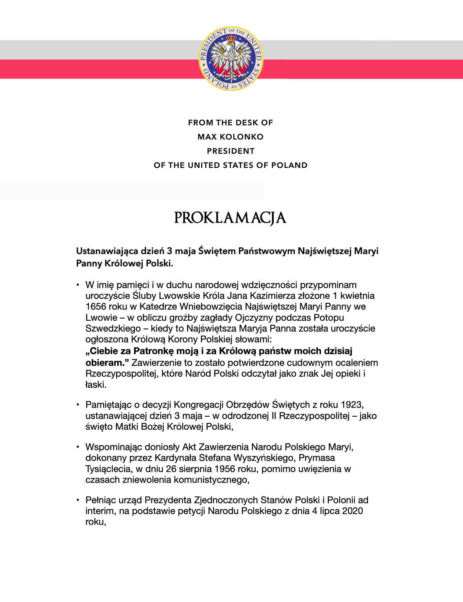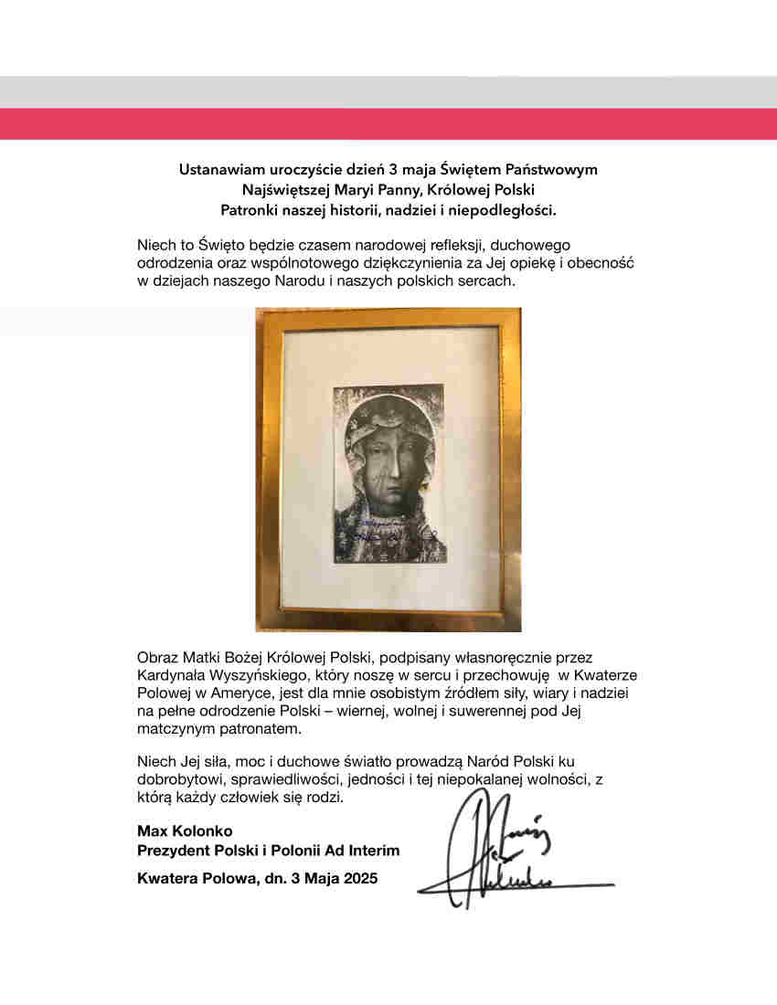 Home / announcements / LETTERS / POTUSPL / Max Kolonko, Prezydent Polski i Polonii ustanawia Dzień 3 maja Świętem Państwowym Najświętszej Maryi Panny Królowej Polski